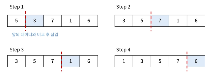 - 앞의 데이터를 정렬 해가면서 삽입 위치를 찾아 정렬하는 방식