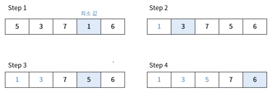 - 최소 또는 최대 값을 찾아서 가장 앞 또는 뒤부터 정렬하는 방식