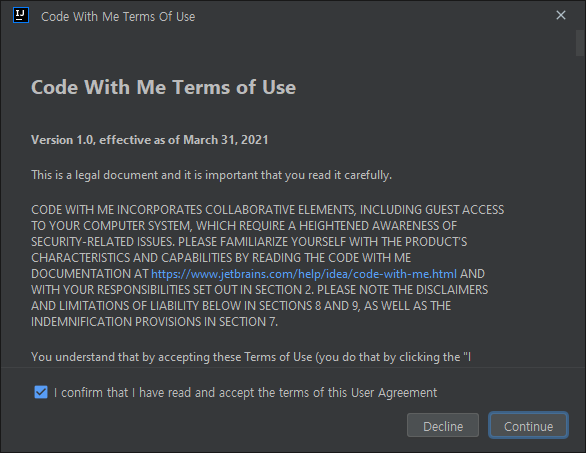IntelliJ 2021.1 버전 이후부터는 `Code With Me`가 번들로서 제공이 되기 때문에