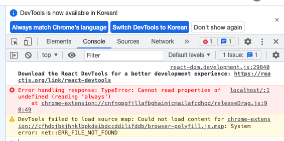 리액트로 배포한 앱에서 디버깅 중 콘솔을 보니 알 수 없는 오류가 발생했다.