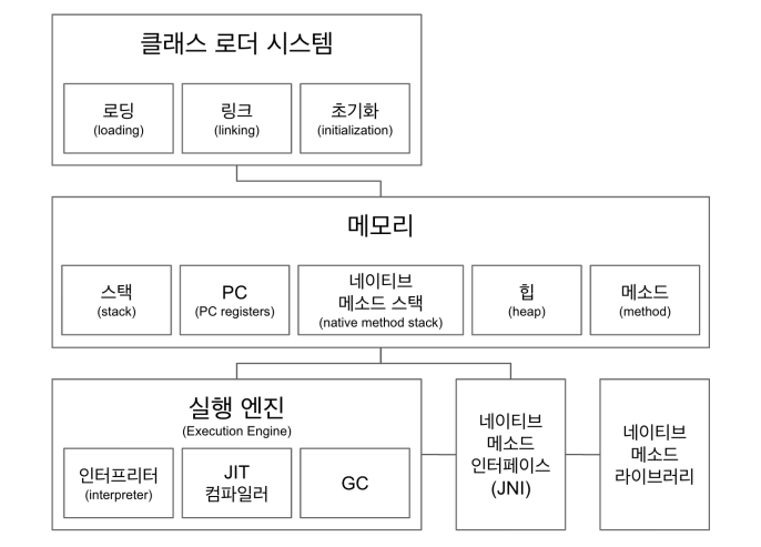 - 5가지 컴포넌트로 구성되어 있다고 볼 수 있지만 네이티브 메소드 인터페이스와 네이티브 메소드 라이브러리는 하나로 묶어서 봐야하기 때문에 크게 4덩어리로 볼 수 있습니다.
